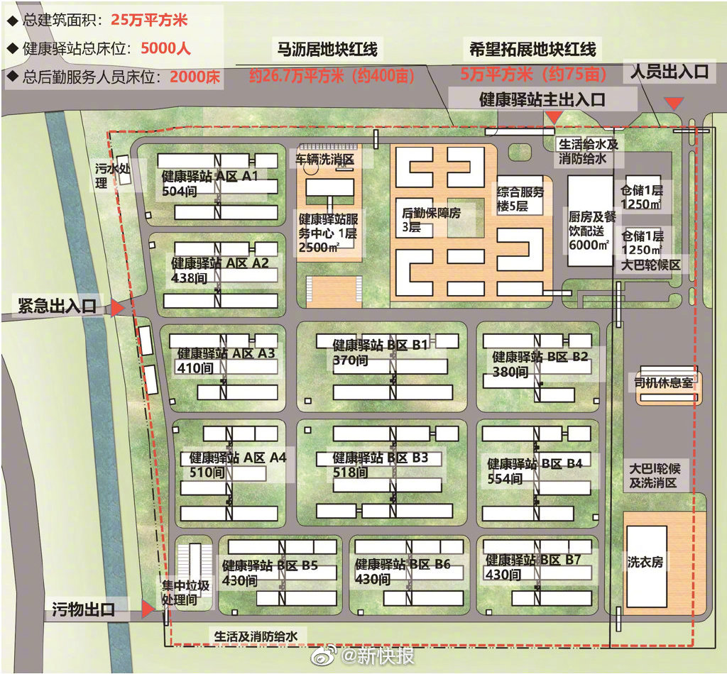 項目總建筑面積約為25萬平方米,擬建設5000張床位的健康驛站,同時可為后勤服務人員提供2000張床位。