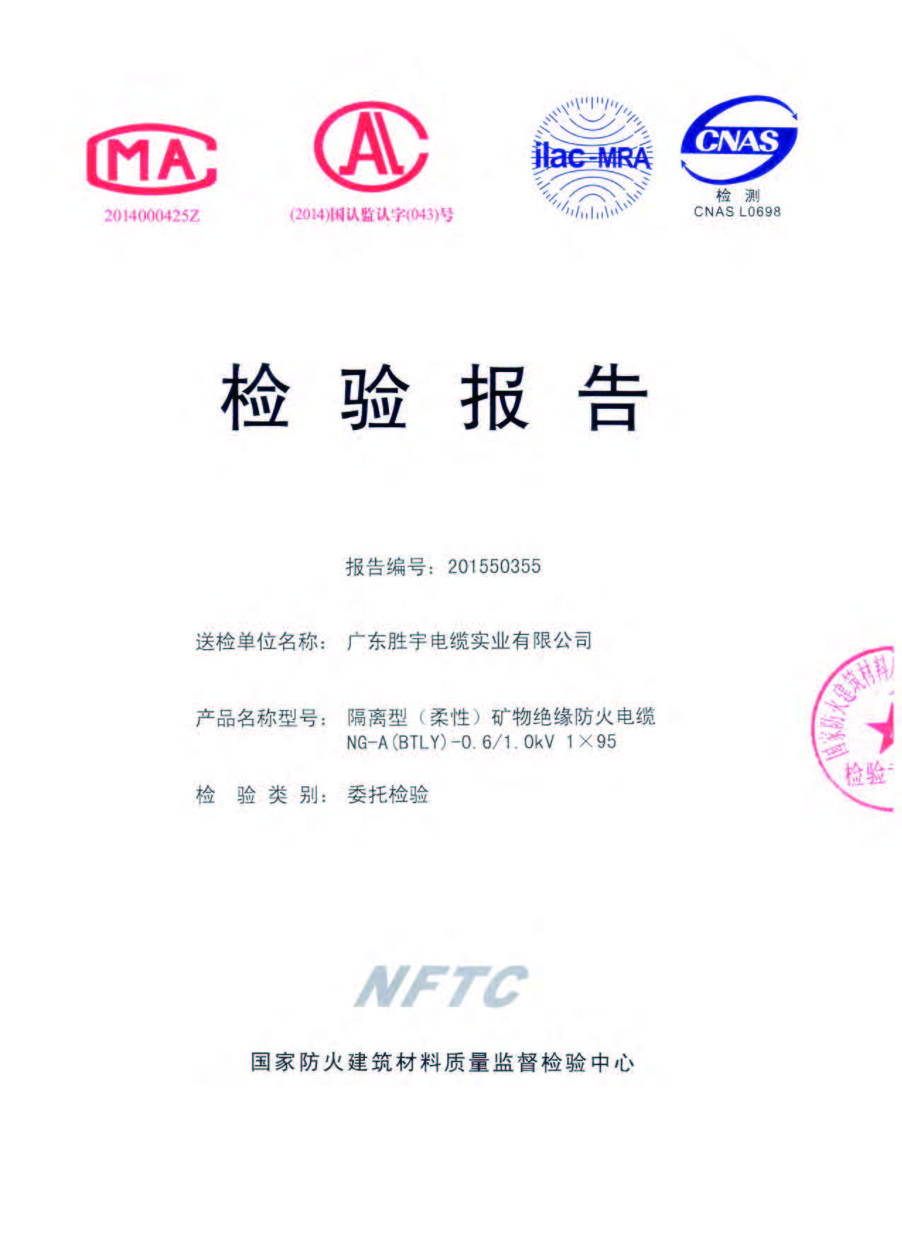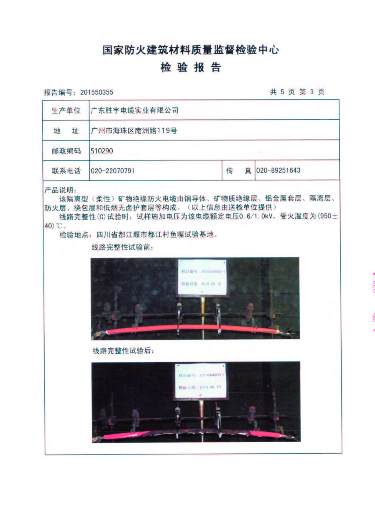 標準中的3個試驗,每做一個新實驗都得換一個新的樣品,勝宇礦物絕緣電纜可以輕松遵守和承受最繁重的等級類別C、W、Z,甚至3個試驗中整個過程中使用同一個電纜樣品不需更換。