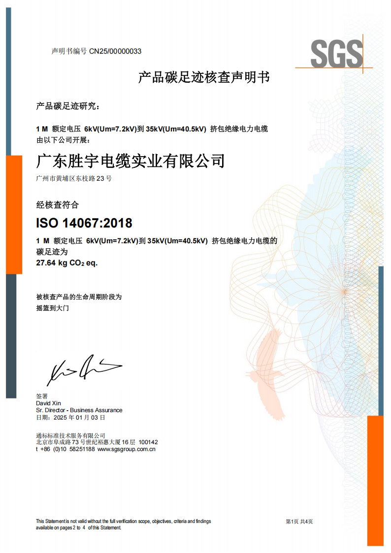 2025年1月,廣東勝宇電纜實(shí)業(yè)有限公司成功獲得了專業(yè)認(rèn)證機(jī)構(gòu)--通標(biāo)標(biāo)準(zhǔn)技術(shù)服務(wù)有限公司(SGS)頒發(fā)的產(chǎn)品碳足跡核查聲明書(shū)、產(chǎn)品生命周期評(píng)價(jià)核查聲明書(shū)。標(biāo)志著勝宇電纜在推進(jìn)綠色低碳環(huán)保、實(shí)現(xiàn)可持續(xù)發(fā)展方面又邁出了關(guān)鍵一步。